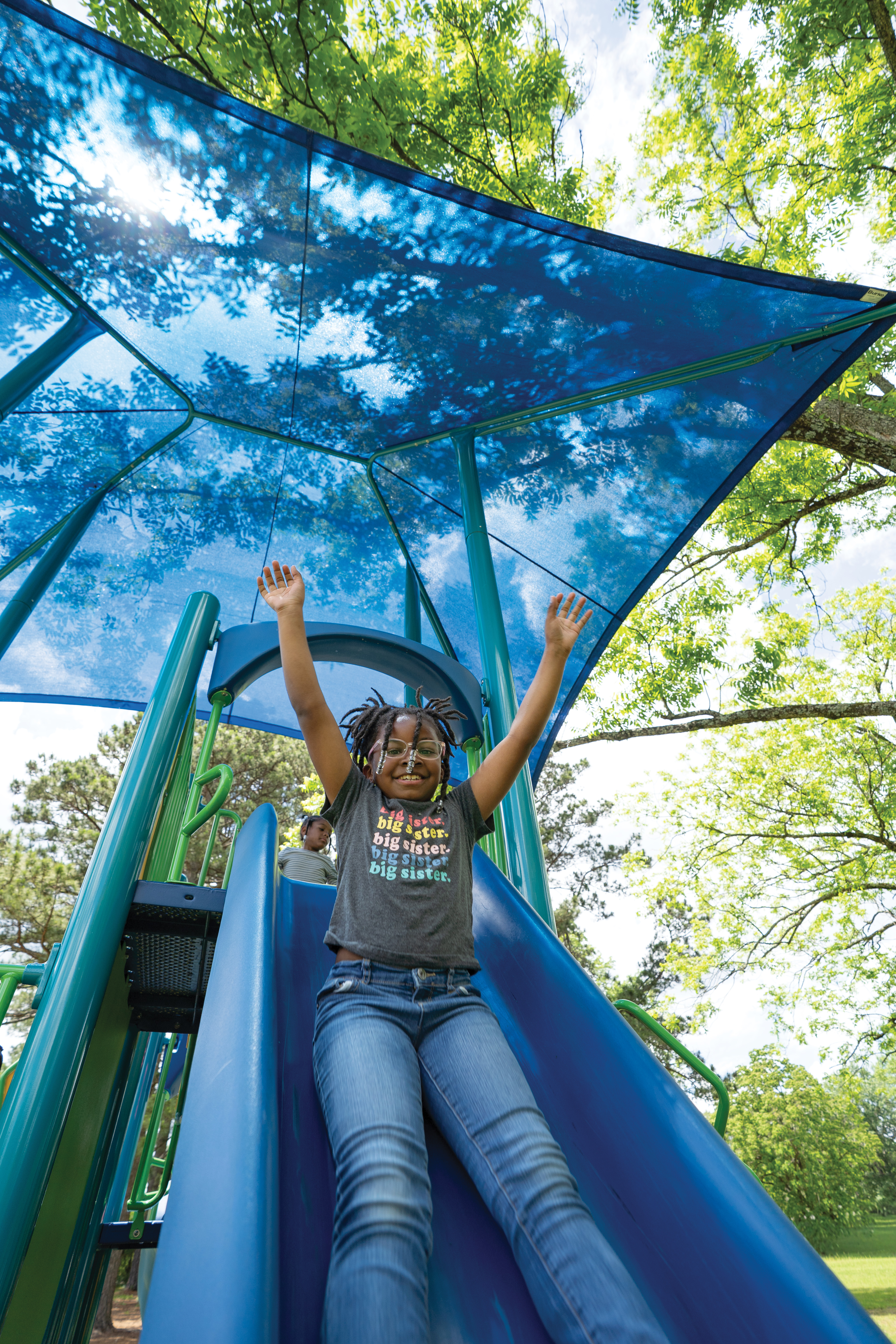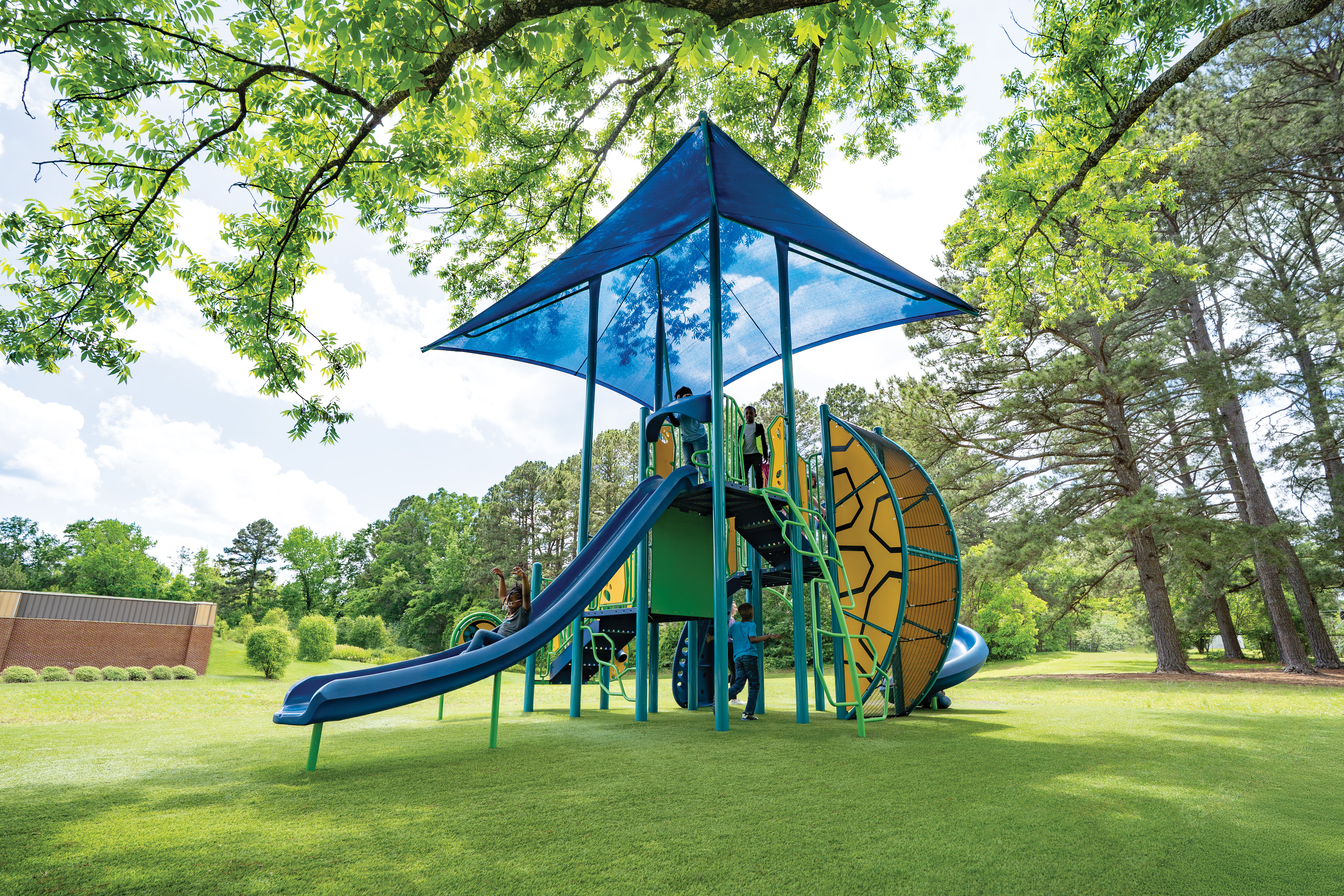 What makes this playspace special isn't just the thoughtful sizing — it's how the ShadePlay® Canopies transform Arkansas heat from a barrier into background. Research shows shade can substantially cool play areas, keeping kids active longer and helping them return to class refreshed rather than overheated.