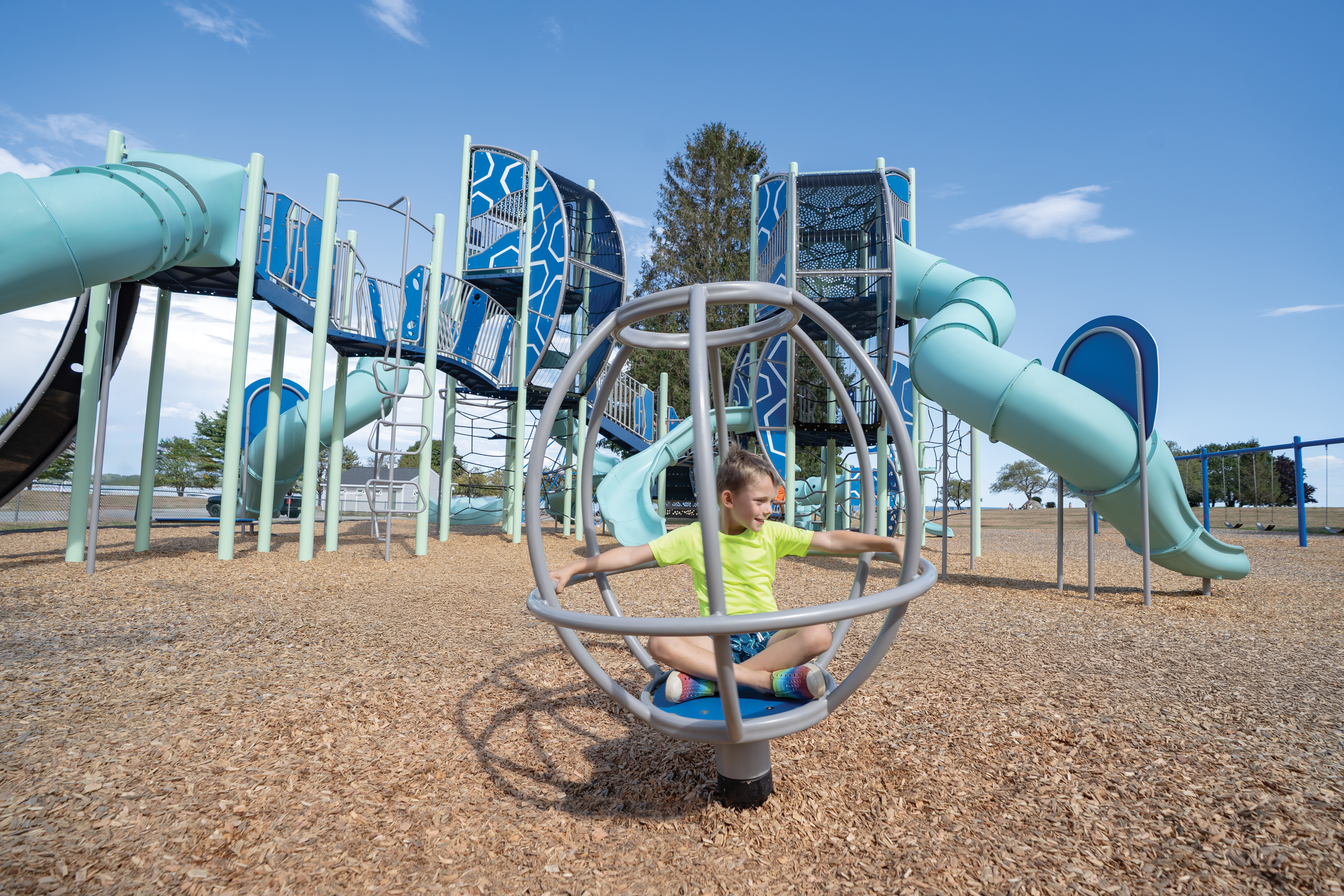 The Orb Rocker™ rocks back and forth with gentle motion — perfect for groups of friends playing together. The Comet Spinner provides whirling fun that captures the energy of this coastal setting. Every element works together to create a playground experience as memorable as the ocean views that surround it.