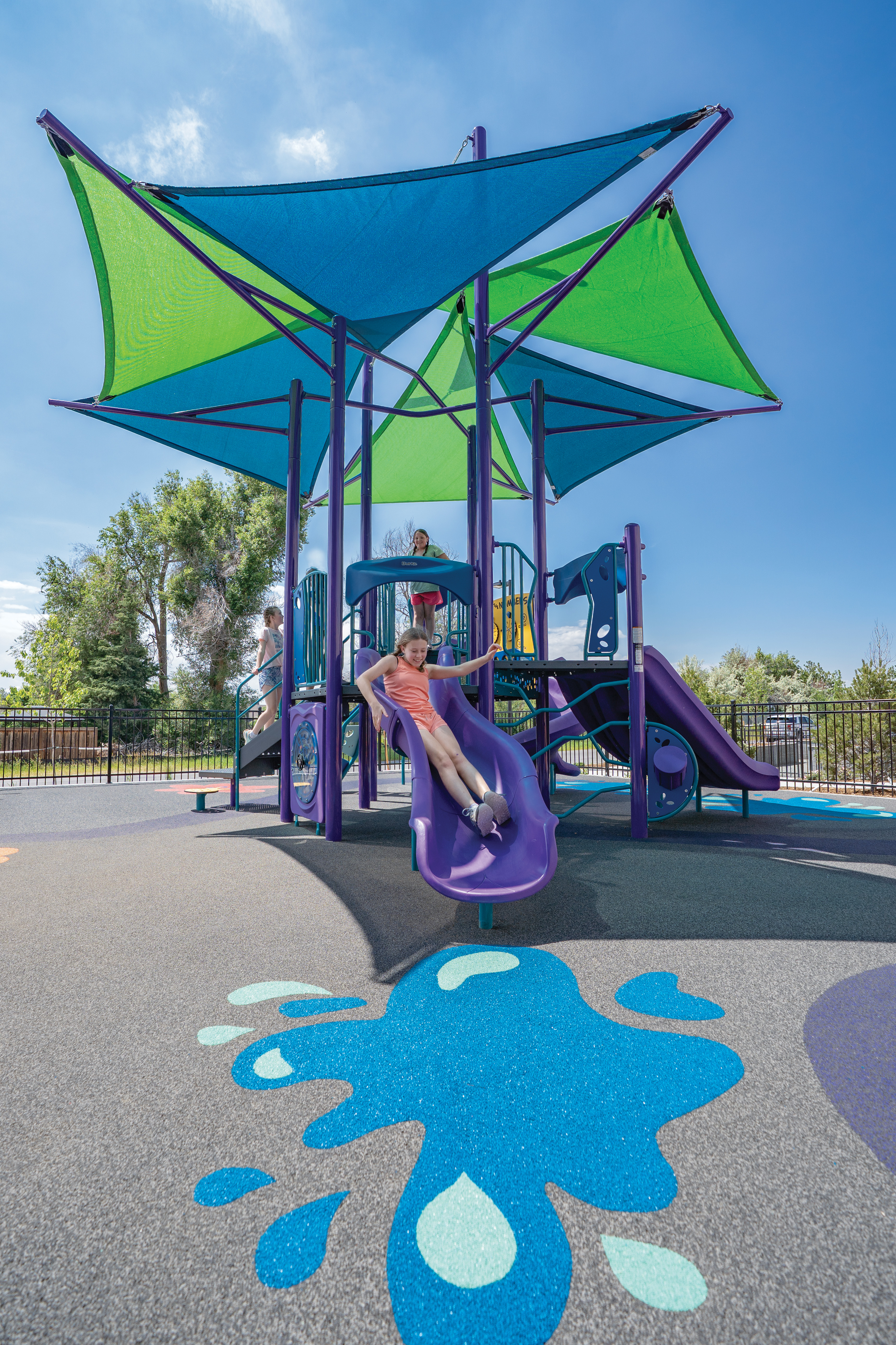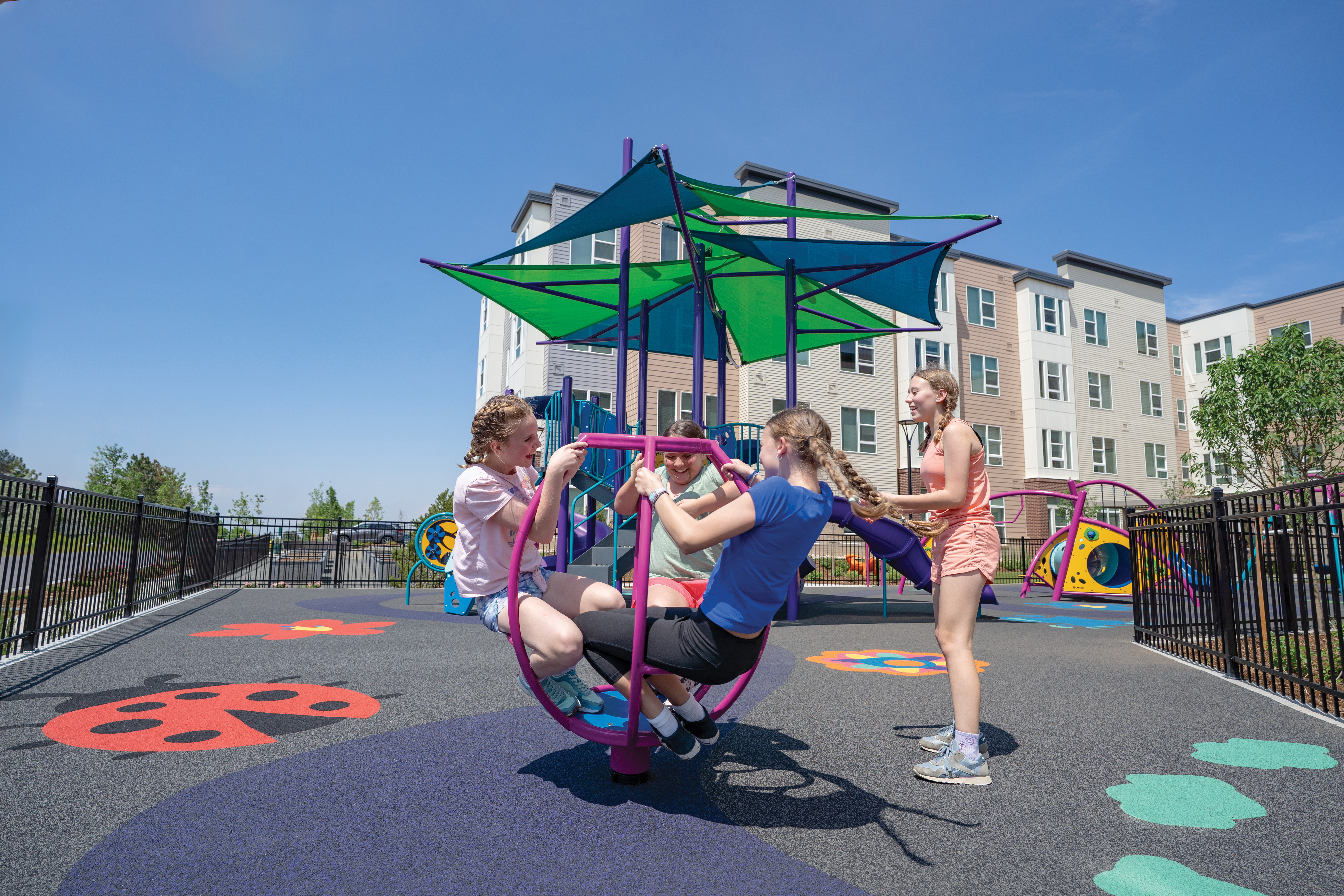 The Nucleus® playground for ages 2-12 anchors the playspace as the centerpiece, protected by an integrated playground shade that keeps climbing surfaces cool even on Colorado's sunniest days. Designed for ages 2-5, the artistic Level X® Launch XL adds sculptural beauty that complements the complex's modern architecture, while the Comet Spinner and Cirrus® Swing deliver those can't-get-enough moments of motion for kids ages 5-12. But it's the bold departure from the expected nature themes that truly sets this playspace apart — a dozen-plus vibrant colors burst across every surface, while whimsical ladybugs, caterpillars and nature designs dance across the durable poured-in-place surfacing. This dynamic color palette adds an extra pop to the complex and the community, tying directly to the apartments' interior design themes.