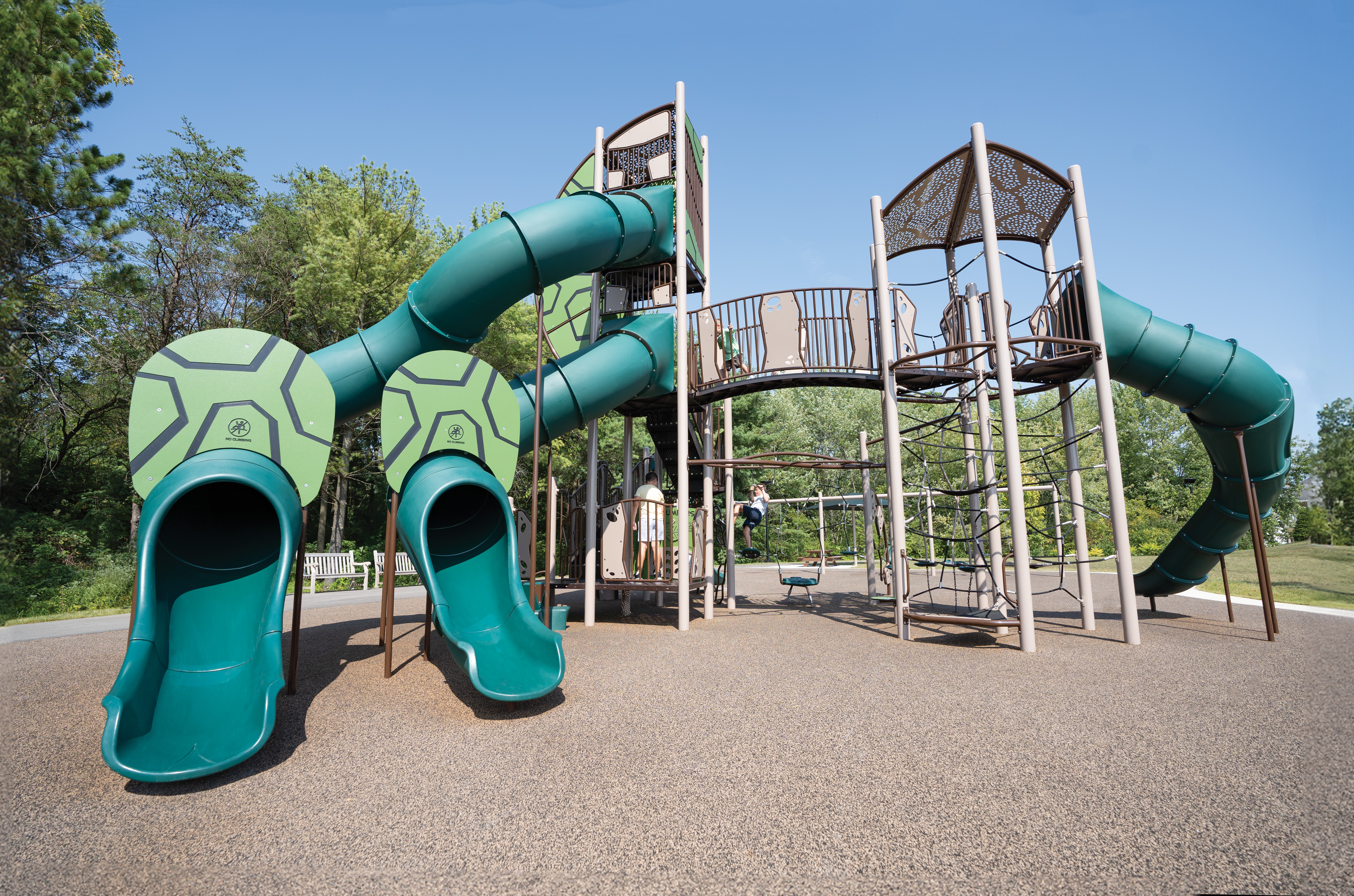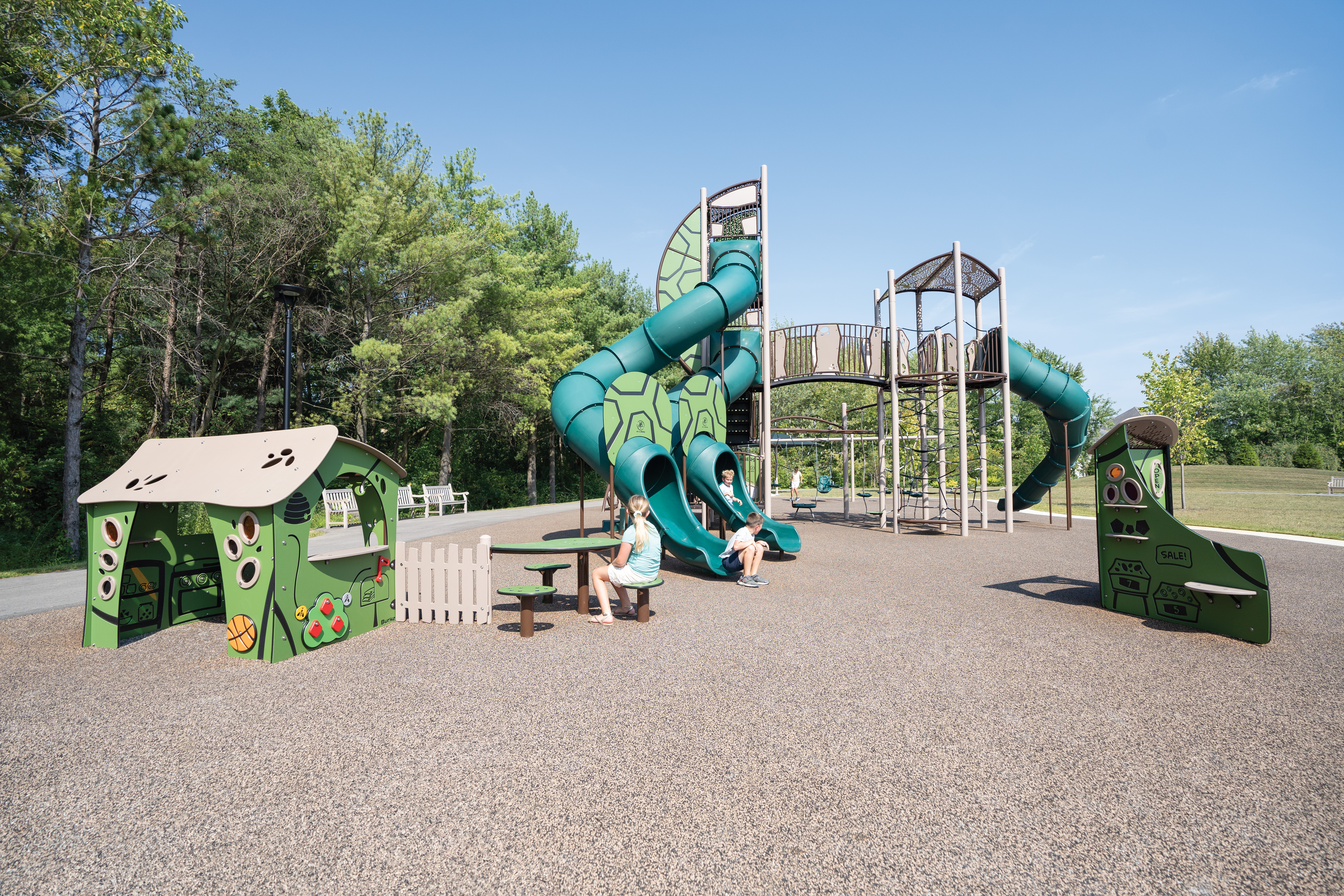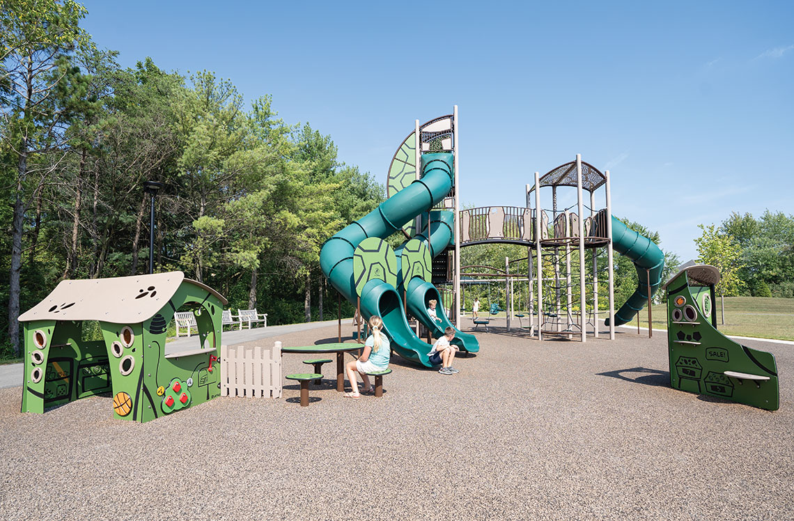 At the heart of the structure, the Nucleus Core® and Taktiks® Bow Climber offer complex and rewarding climbing experiences for kids ages 5-12. Children develop strength, balance and problem-solving skills as they navigate the intricate web of ropes and platforms. For those seeking imaginative adventures, the aptly customized Market Discovery Station™ and adjacent PlayHouse provide the perfect backdrop for creative role-playing and social interaction. These structures are complemented by the Lil' Novo Playful Furniture™, a charming spot for friends to gather and connect.