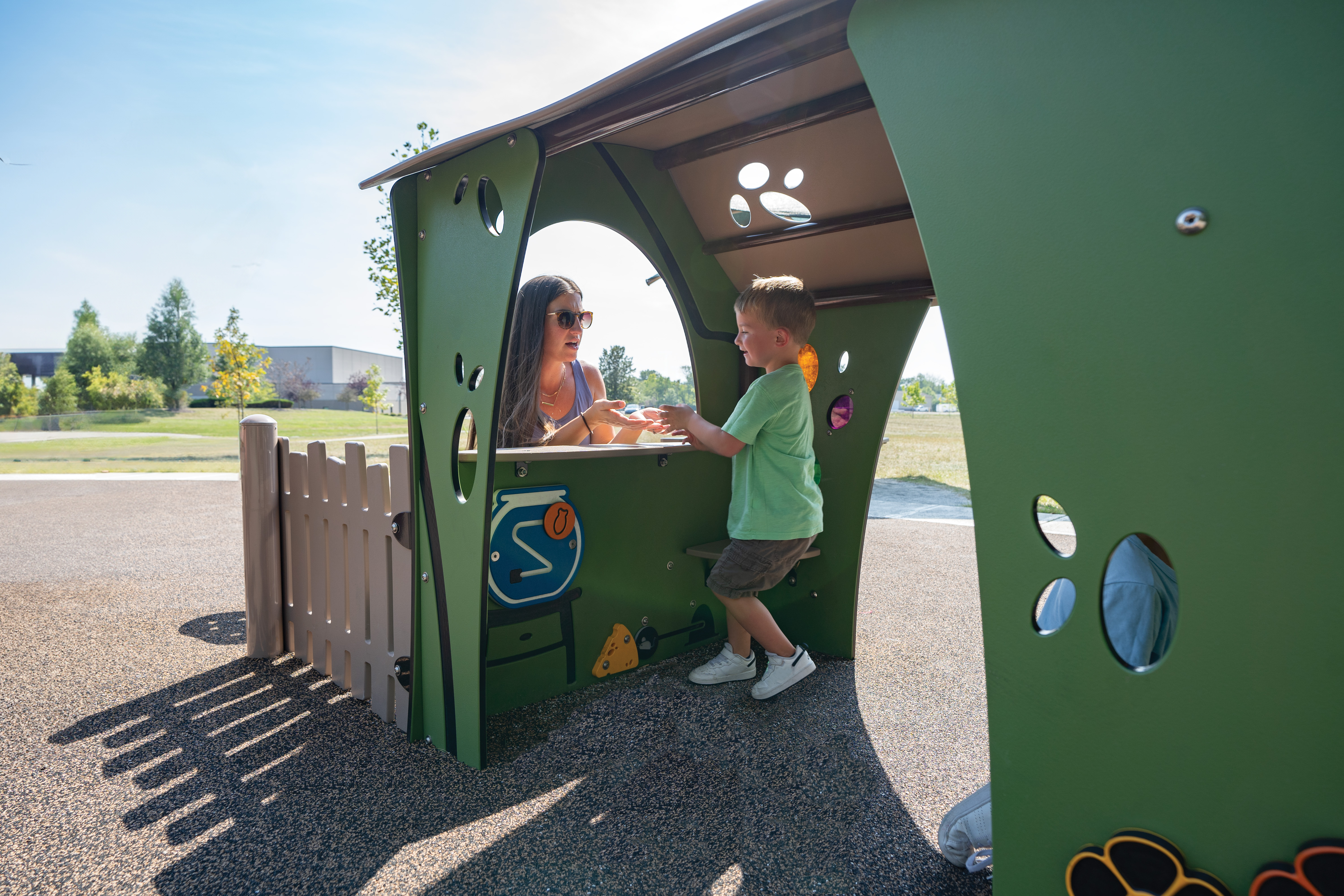 Beyond traditional play, the playground incorporates purposeful learning opportunities. The StemPlay® educational panels invite curious minds to explore STEM-based learning through interactive discovery. Nearby, the freestanding KidForce Spinner offers exhilarating vestibular input, providing a fun and inclusive sensory experience for children of all abilities. From thrilling slides to quiet corners, The Portico playground is a place where every child can find their own way to play and belong.