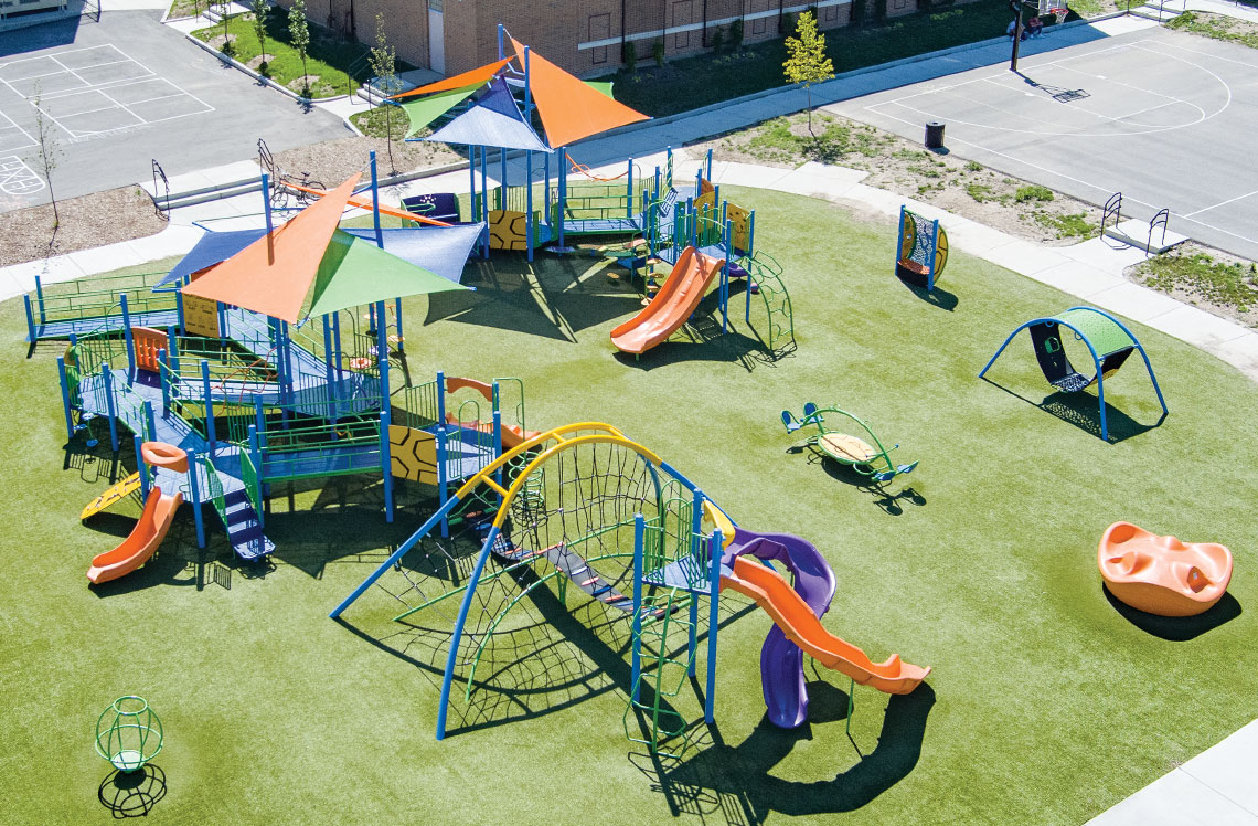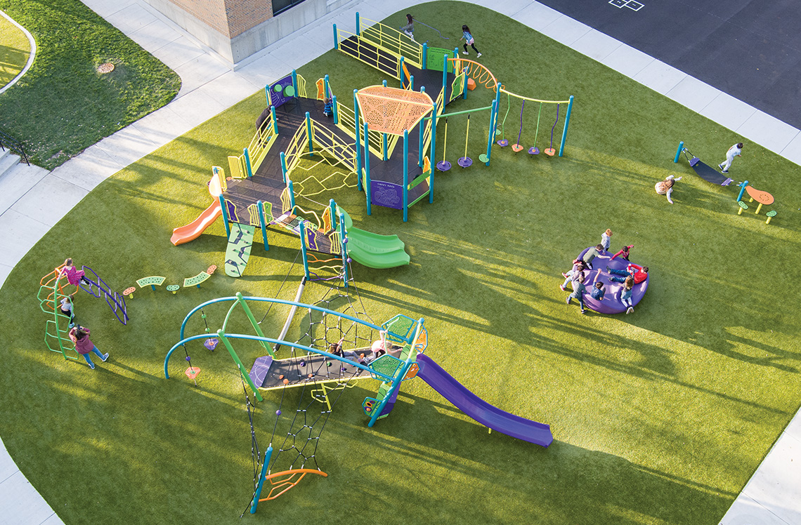 Play for all is the theme of these Burke play environments within the Wauwatosa School District in Wisconsin! Built upon beautiful, accessible turf surfaces, these fully inclusive ramped play structures summon everyone into the heart of play and offer a variety of options for socialization, development and just plain fun. Rocking, climbing, spinning, games, imagination and more for children ages 2-12 is the perfect way to get kids outside and moving together before and after school and during recess. In Tosa, everyone can play together!
