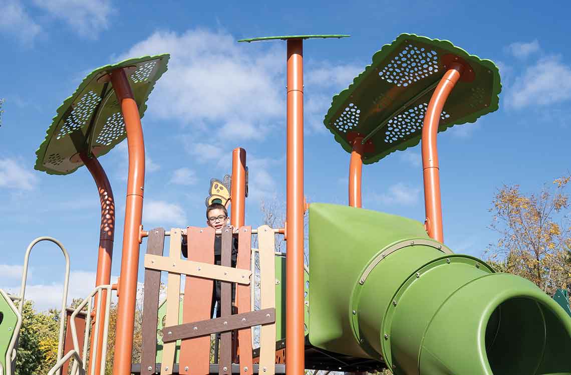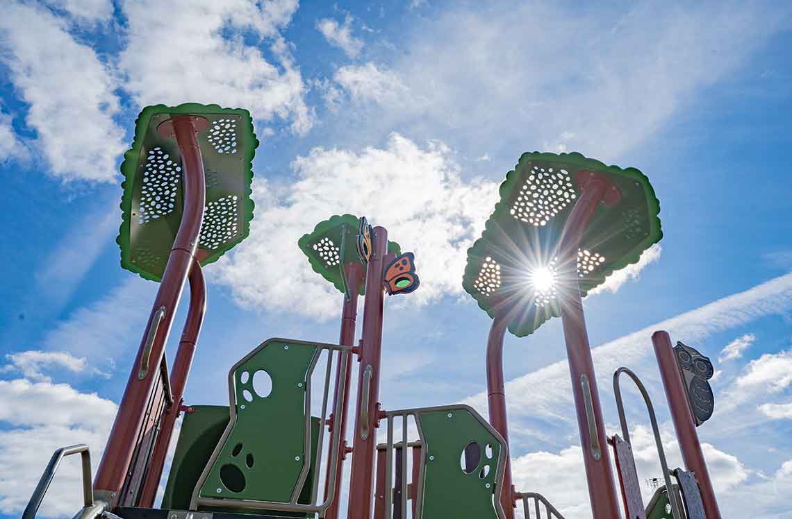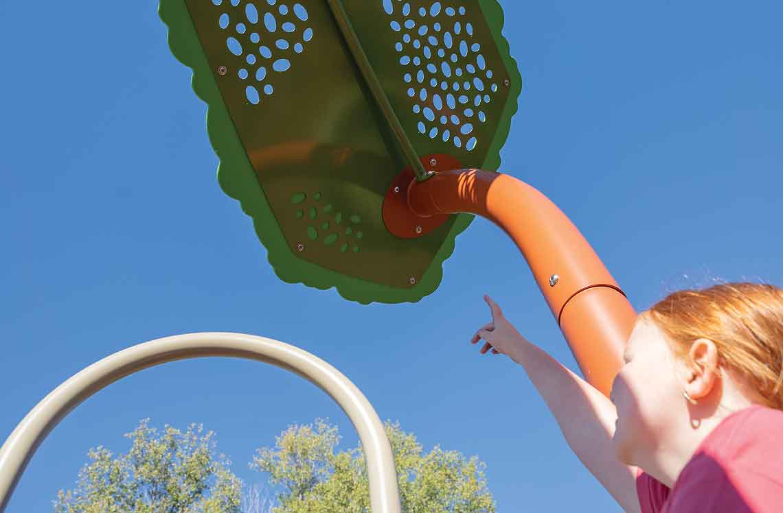 Designed with biophilic forms and layered silhouettes, the Canopy Double Post Topper creates the feeling of play under the dappled shade of a tree. It adds vertical depth, color variety and a natural finishing touch to any play structure, bringing the restorative qualities of nature to the built environment.