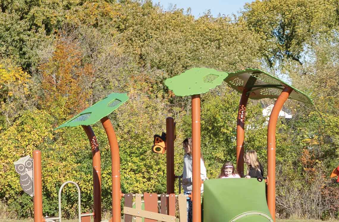 Designed with biophilic forms and layered silhouettes, the Canopy Single Post Topper creates the feeling of play under the dappled shade of a tree. It adds vertical depth, color variety and a natural finishing touch to any play structure, bringing the restorative qualities of nature to the built environment.