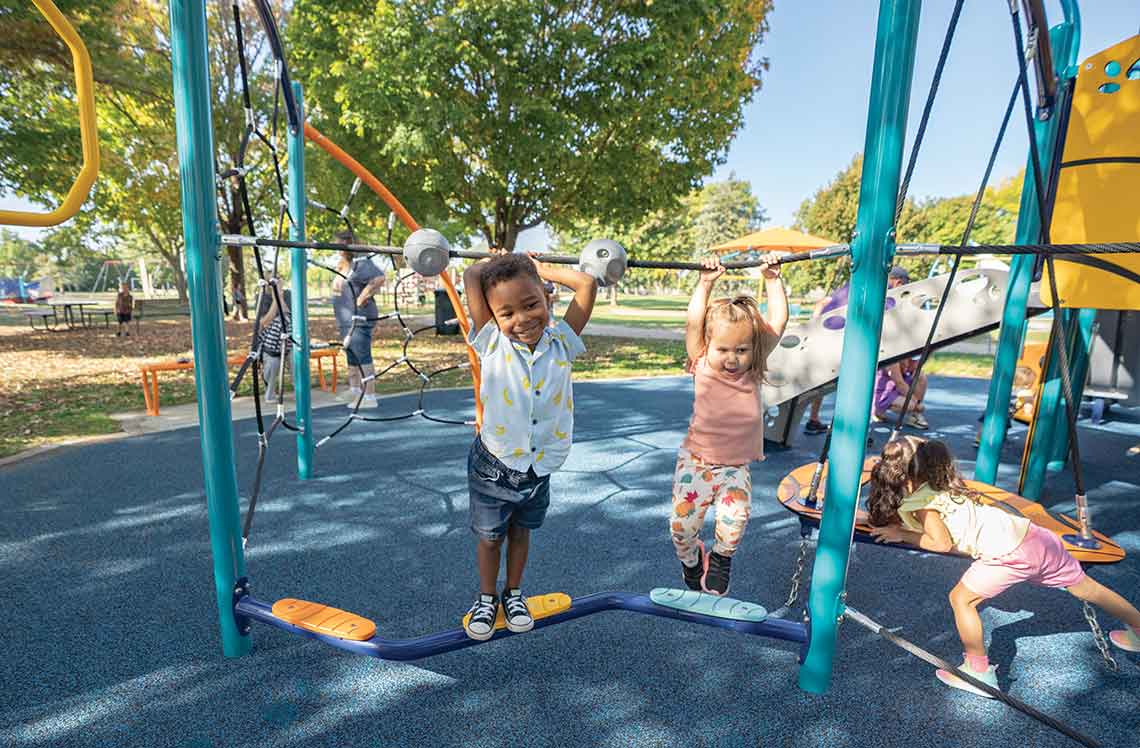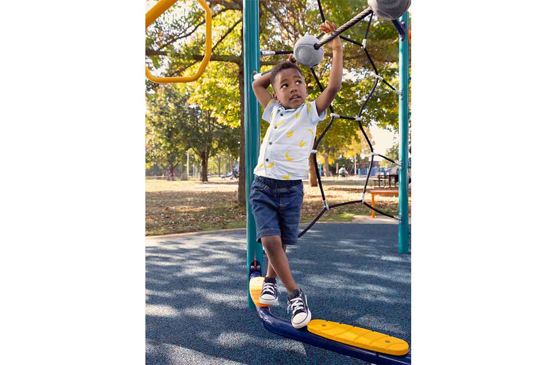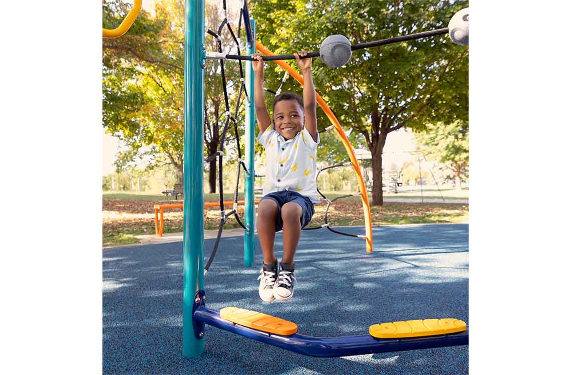 The Ledge Link helps children develop balance, agility and motor skills while offering a fun way to move through the playspace. It combines physical activity with sensory play through sound-producing balls positioned on the top rope that make noise when moved, textured foot placements along the bottom and vibrant color options throughout the entire climber for added visual appeal. Add the Ledge Link to your Synergy® playground to promote movement, development and fun for kids ages 2–12.