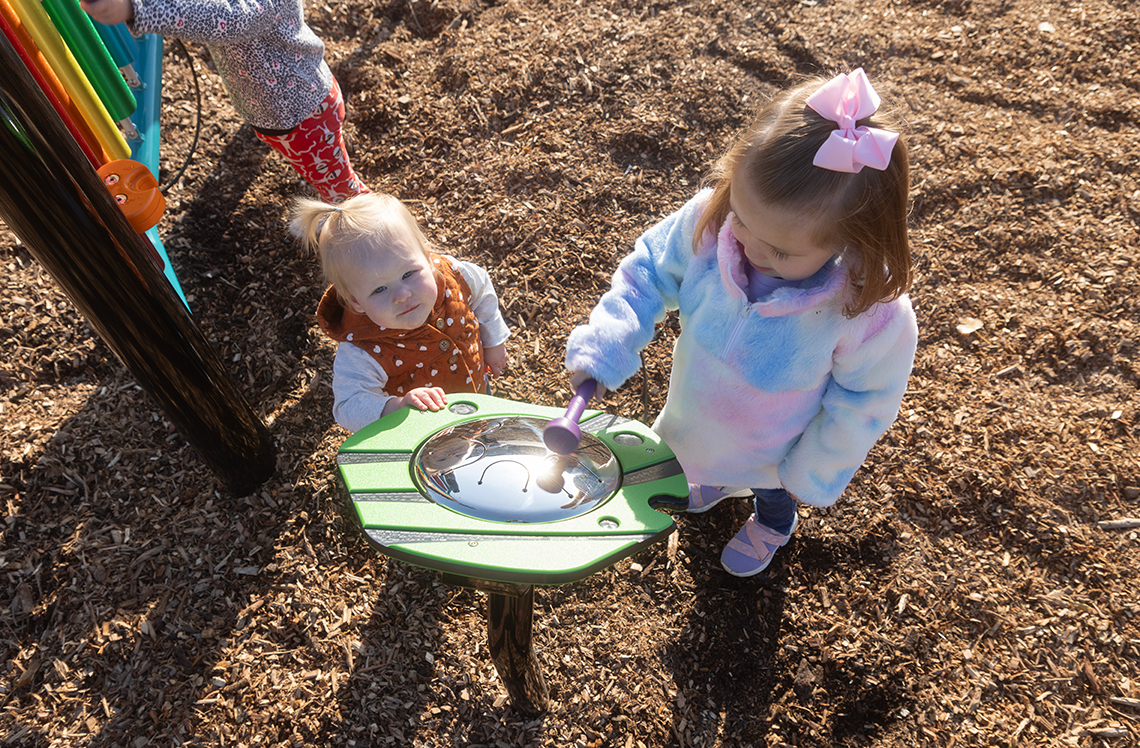 Add sweet vibrations to your playground, sensory garden or outdoor space with new PlayEnsemble® Outdoor Musical Instruments. These fun pieces are developmentally rich, inherently inclusive and incredibly engaging for people of all ages and abilities. The Babel Drum is a unique instrument that looks and plays like a drum but sounds like a bell or chime. The Babel Drum offers design versatility and a small footprint that can be placed with another PlayEnsemble instruments or on any post in a Nucleus playspace.