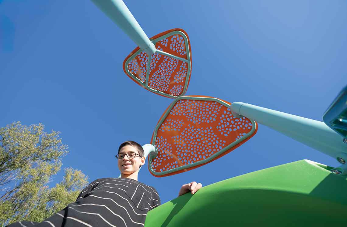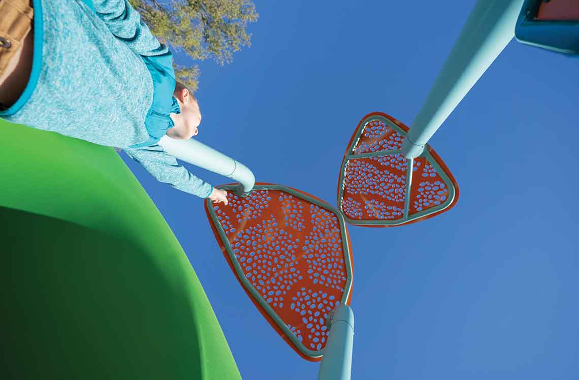 Solis and Solis XL bring sculptural design to play and reimagine what playground post toppers can be. Their leaf-inspired forms filter light to create natural shadow patterns — inviting wonder, movement and imagination. Also available in Hue, a translucent material that softens sunlight and expands color options, these elements help connect people to nature through form, light and a sensory experience.