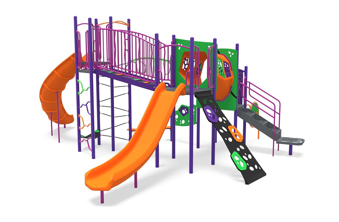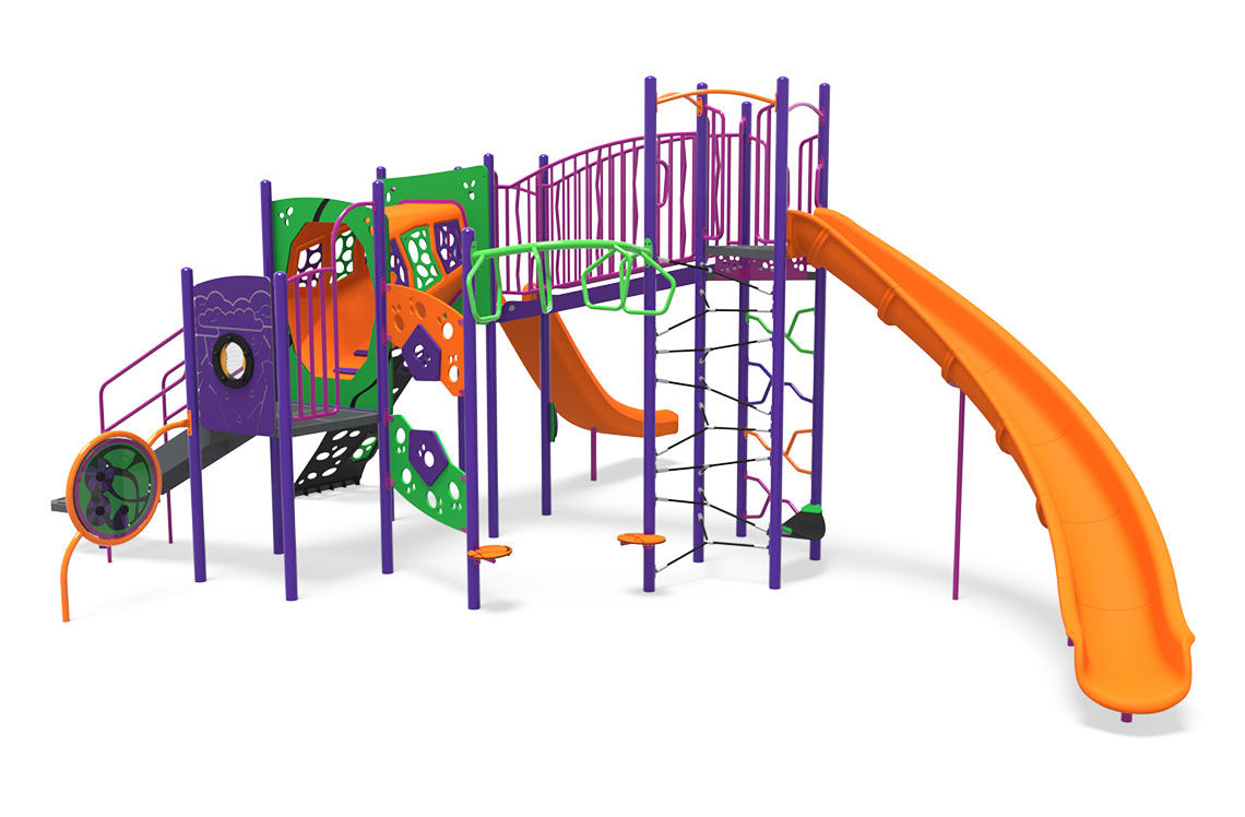 This Synergy® play structure fits seamlessly with the natural environment while stimulating a child’s curiosity and excitement. It makes the most of limited space by combining elements such as slides, spinners, climbing events and interactive panels.