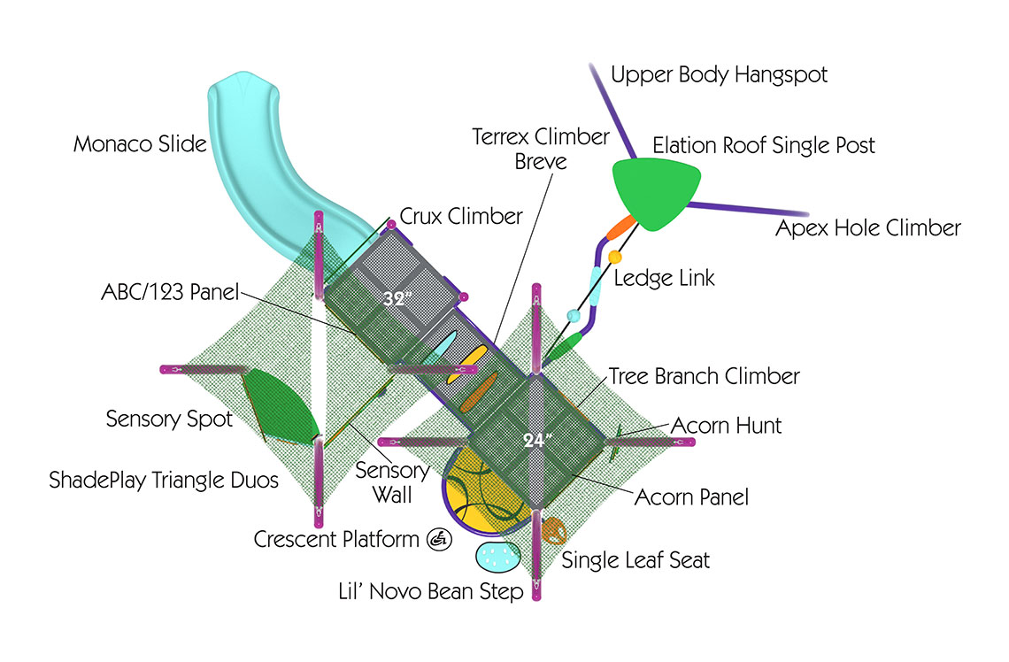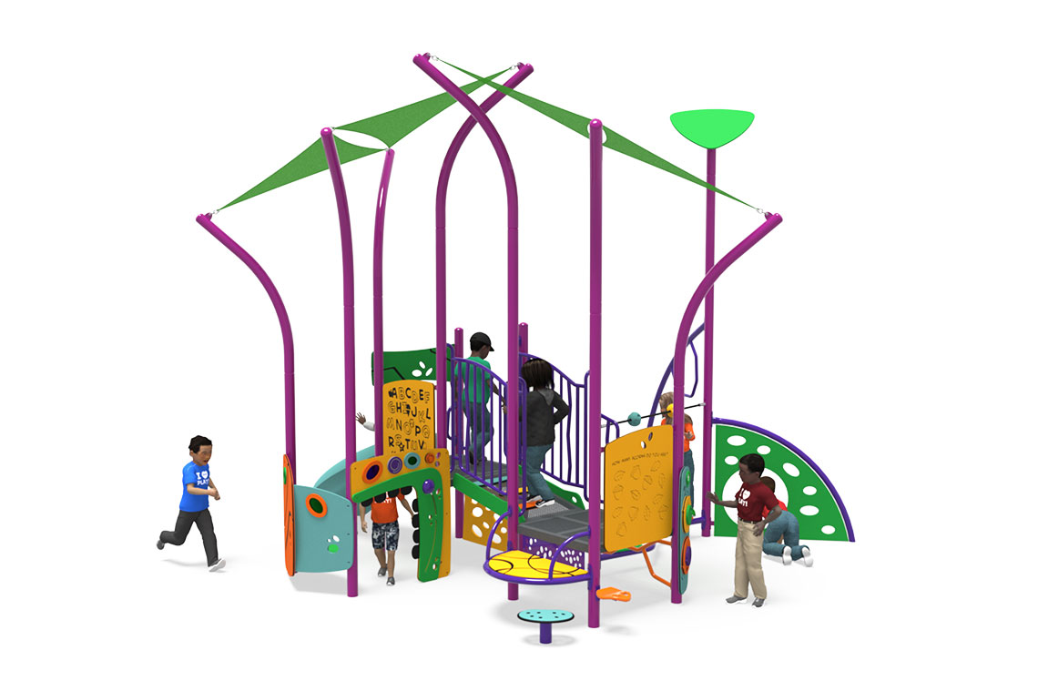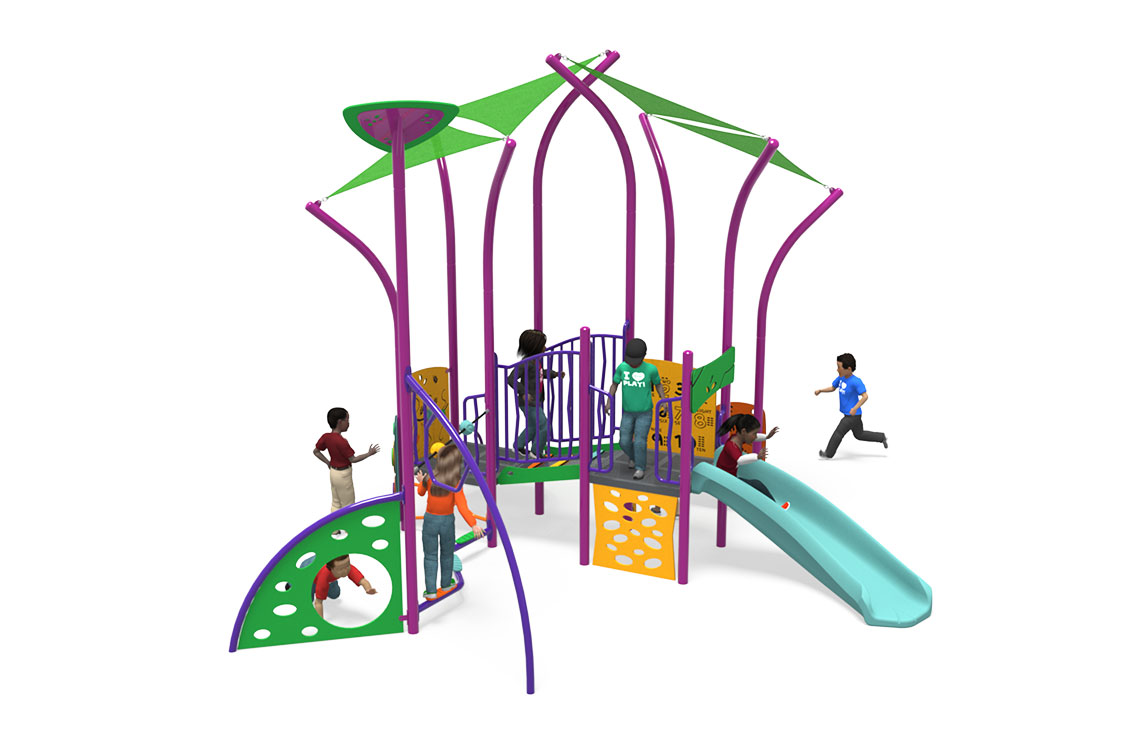 This Synergy® play structure fits seamlessly with the natural environment while stimulating a child’s curiosity and excitement. It makes the most of limited space by combining elements such as slides, spinners, climbing events and interactive panels.