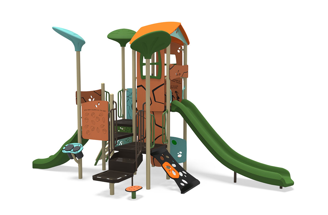 This Synergy® play structure fits seamlessly with the natural environment while stimulating a child’s curiosity and excitement. It makes the most of limited space by combining elements such as slides, spinners, climbing events and interactive panels.