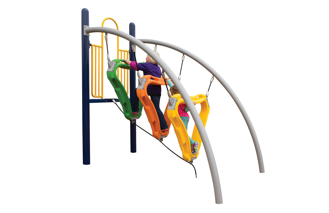 Climbing adventures take shape with the Trigon Arch Climber. Children can maneuver over, around and through the suspended triangle shaped rings and have fun while honing important skills like balance, hand/foot coordination and cognitive planning! Use as a ground to deck connection or as the crux of a freestanding event that provides hours of climbing fun and skill building!